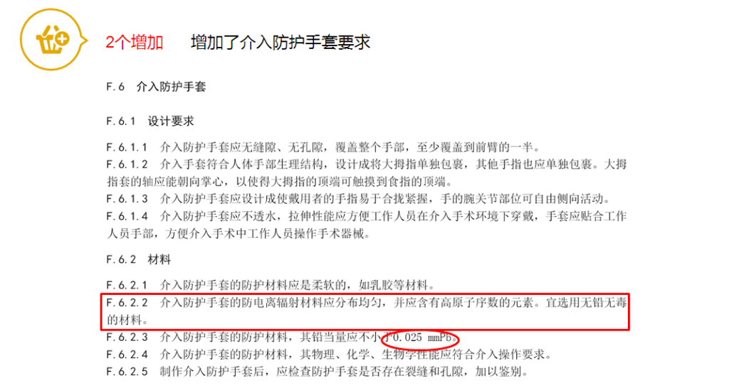 另外一个增加为介入防护手套的要求,铅当量要求为0.025mmPb,推荐用无铅无毒的材料制作。