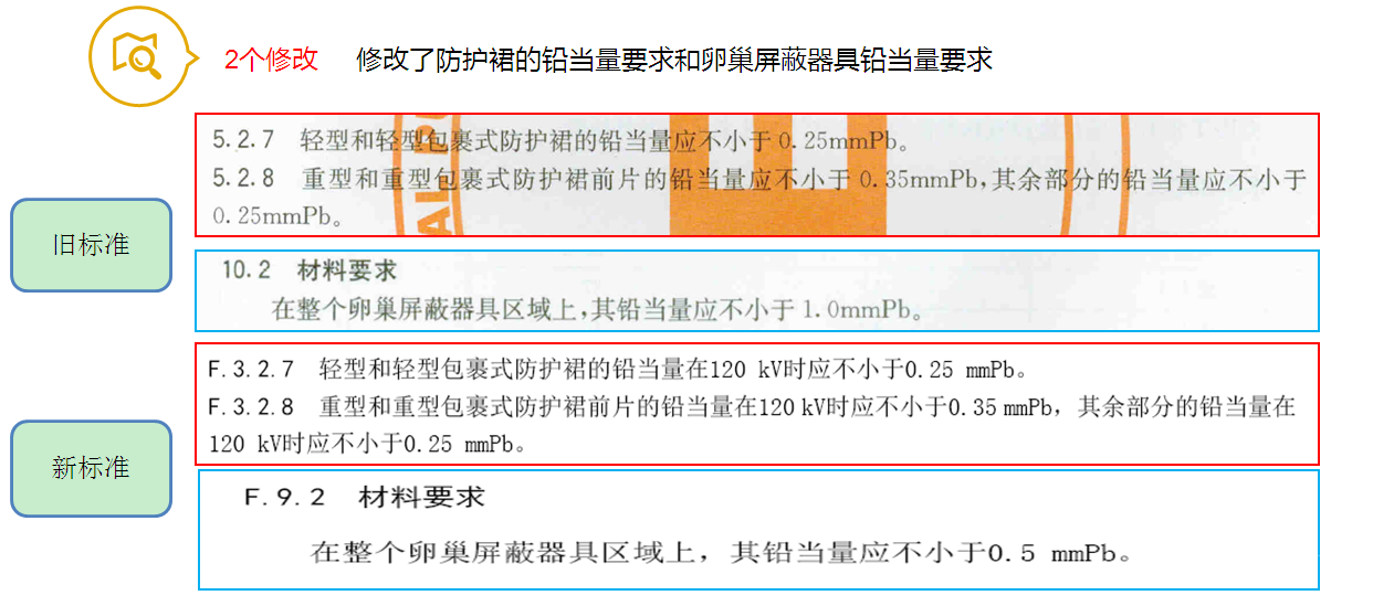 由上可见,2个修改主要为修改了防护裙铅当量要求的检测条件应在120kV条件下不低于对应要求,降低了卵巢屏蔽器具的铅当量,由1.0mmPb降低为0.5mmPb。